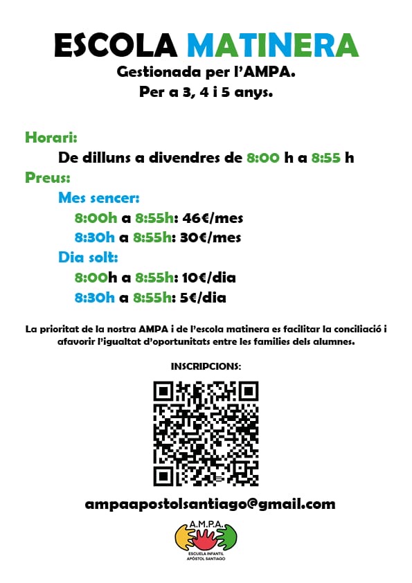 - Forma de pago: Transferencia bancaria a AMPA E.I. Apòstol Santiago ES32 2100 4142 5722 0015 3240