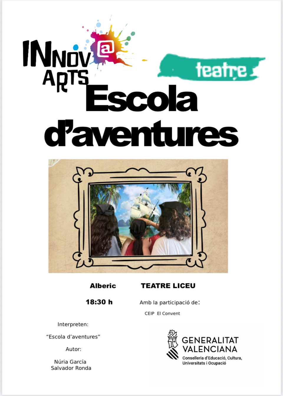El nostre alumnat de tercer , quart, cinqué i sisé va representar Escola d’Aventures dins del Programa d’InnovaArts. Ha estat un extens treball de programació, coordinació i esforç personal per part dels docents: Eva i Clara. Dins de l’obra de Teatre l’alumnat ha desenvolupat funcions com: