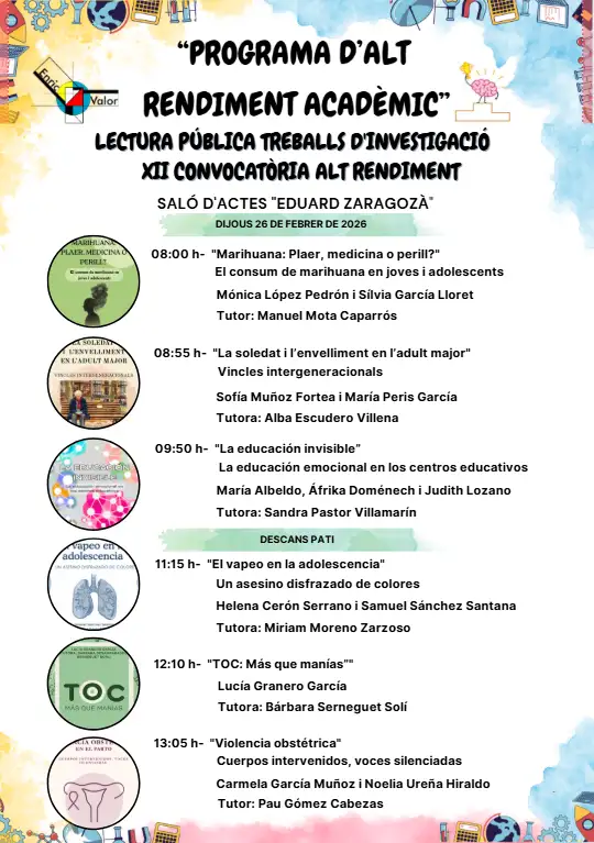 L’alumnat de 2n de Batxillerat continua desenvolupant diverses actuacions vinculades als seus treballs d’investigació i a les propostes de millora que se’n deriven, amb l’objectiu de traslladar els seus aprenentatges a la comunitat educativa i a l’entorn més proper.