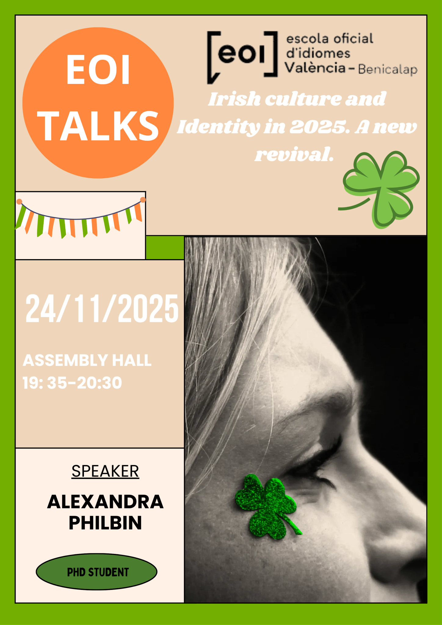 Dilluns, 24 de novembre, a les 19:30, Alexandra Philbin ens farà una xerrada anomenada Irish culture and identity. Convidem tot l’alumnat a assistir-hi, tot i que recomanem tindre un nivell B1 d’anglés per poder-la seguir.