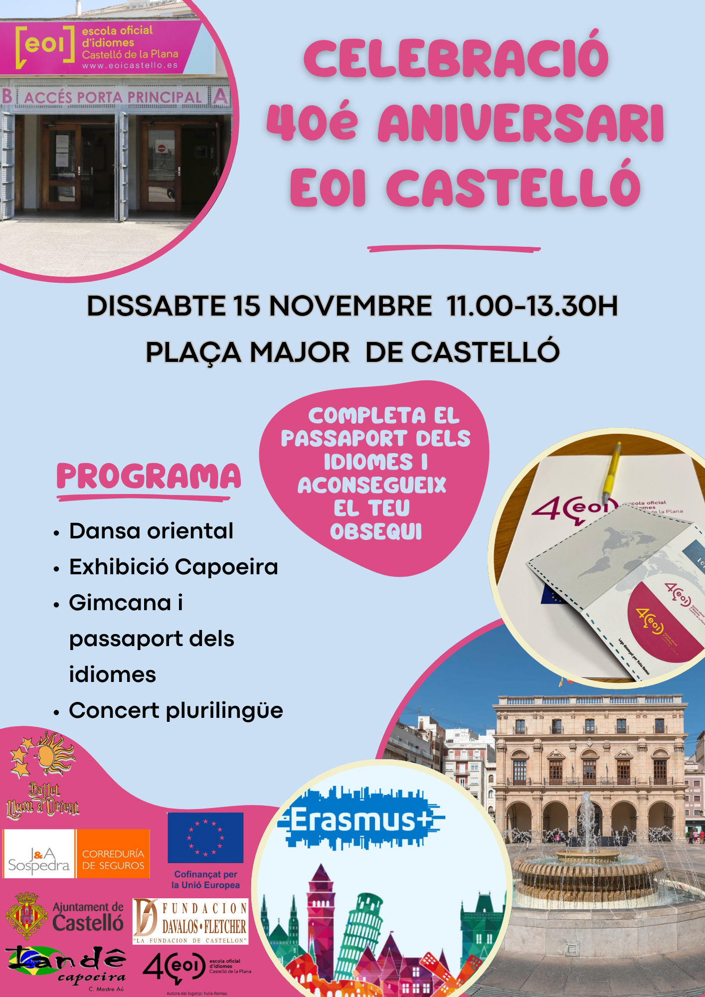 El 15 de novembre, la plaça Major de Castelló es transformarà en un espai multicultural i festiu per celebrar una gran jornada cultural oberta a tota la ciutadania. L’esdeveniment inclourà actuacions de capoeira, dansa del ventre, un concert plurilingüe i una nova edició del “Passaport dels idiomes” perquè tothom puga gaudir i aprendre d’una manera lúdica.