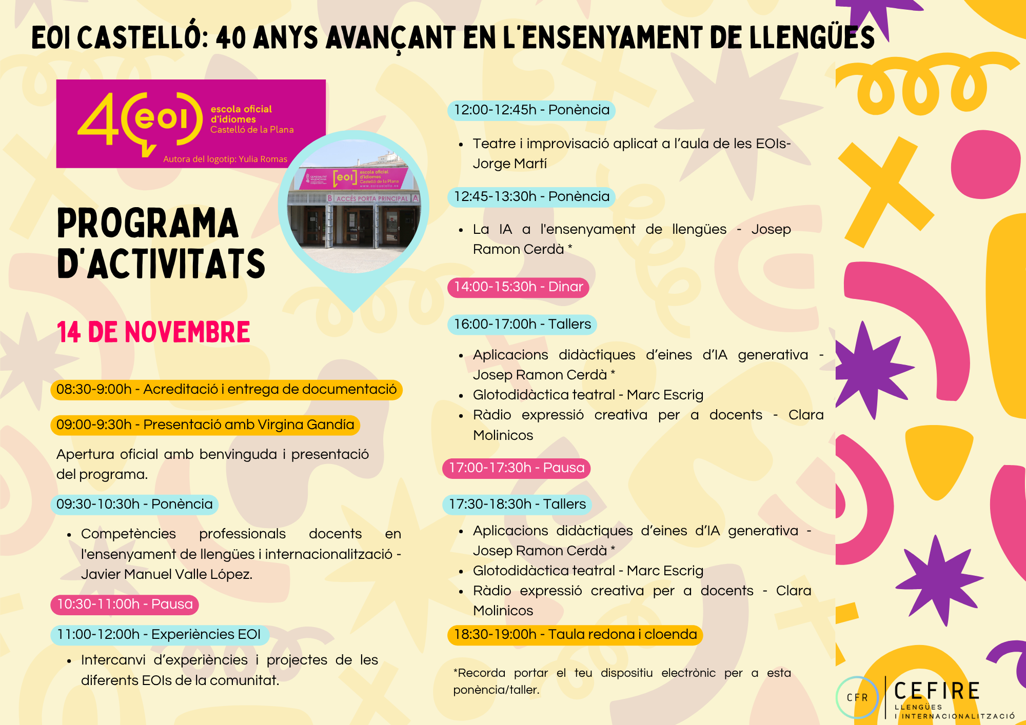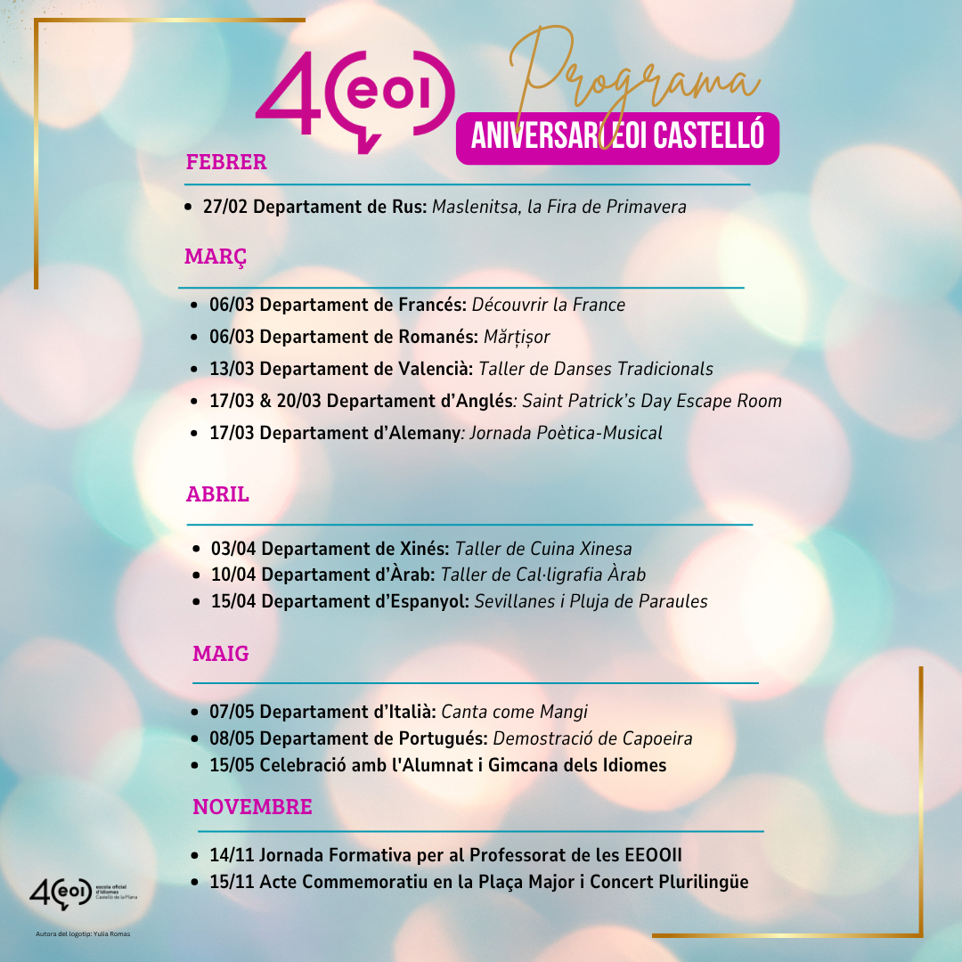 Al llarg del curs, els diferents departaments de llengües han organitzat una gran varietat d’activitats per contribuir a la celebració del 40è aniversari de l’EOI. Aquestes propostes han reflectit la riquesa i la diversitat cultural i lingüística del centre, tot afavorint un vincle més estret entre l’alumnat i el professorat a través d’un aprenentatge actiu i significatiu.