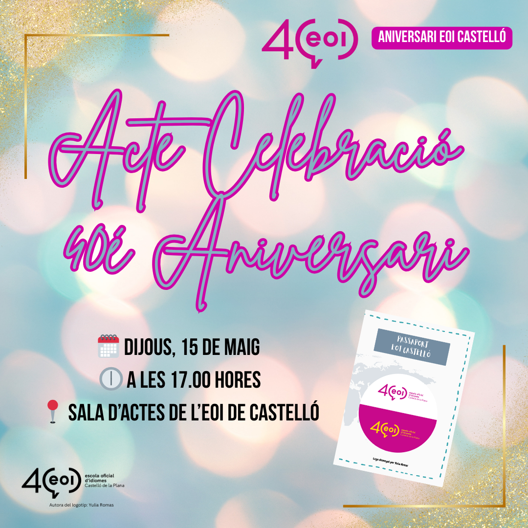 El passat 15 de maig vam celebrar amb gran il·lusió l’acte central del 40è aniversari de l’Escola Oficial d’Idiomes de Castelló. En aquest esdeveniment, al qual van assistir diverses personalitats i membres destacats de la comunitat educativa, vam voler retre homenatge al treball i dedicació de tot el personal docent, directors, alumnat i PAS que ha format part de la nostra història.