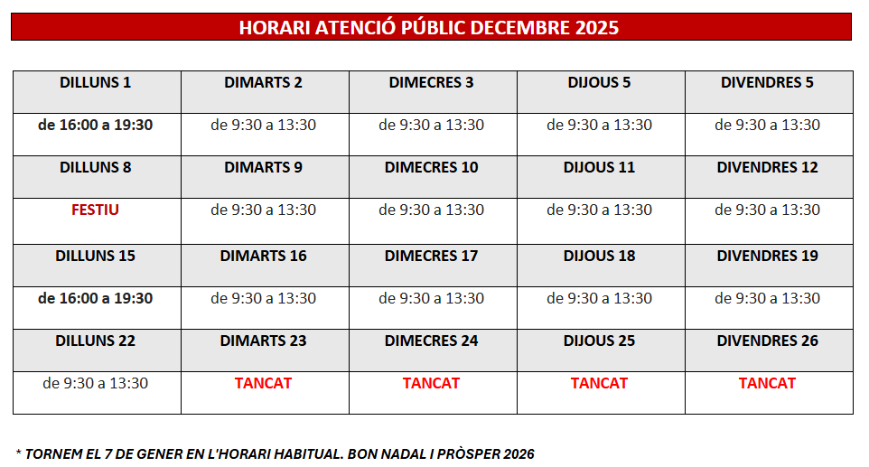 - Horari d’octubre a maig: Dilluns: de 16.00 a 19.30 hores. De dimarts a divendres: de 09.30 a 13.30