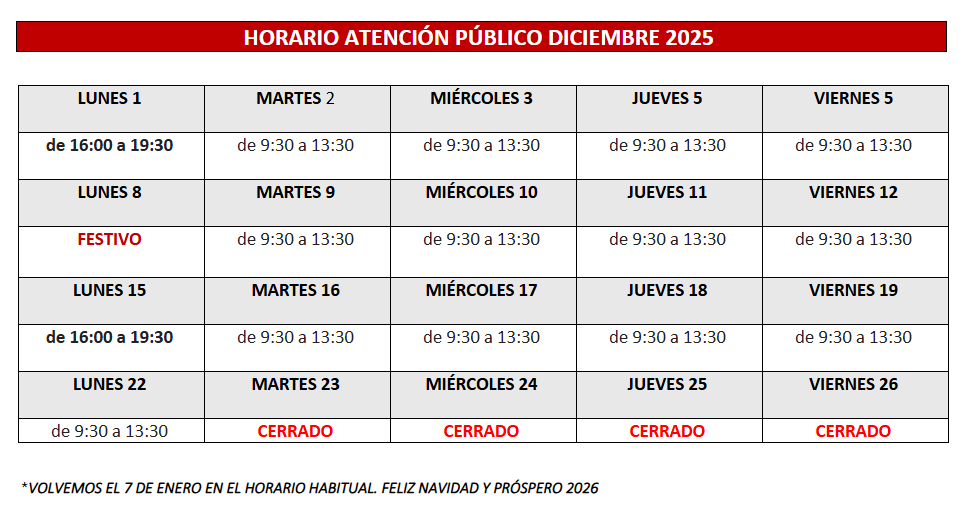 - Horario de octubre a mayo: Lunes: de 16:00 a 19:30 horas. De martes a viernes: de 09:30 a 13:30