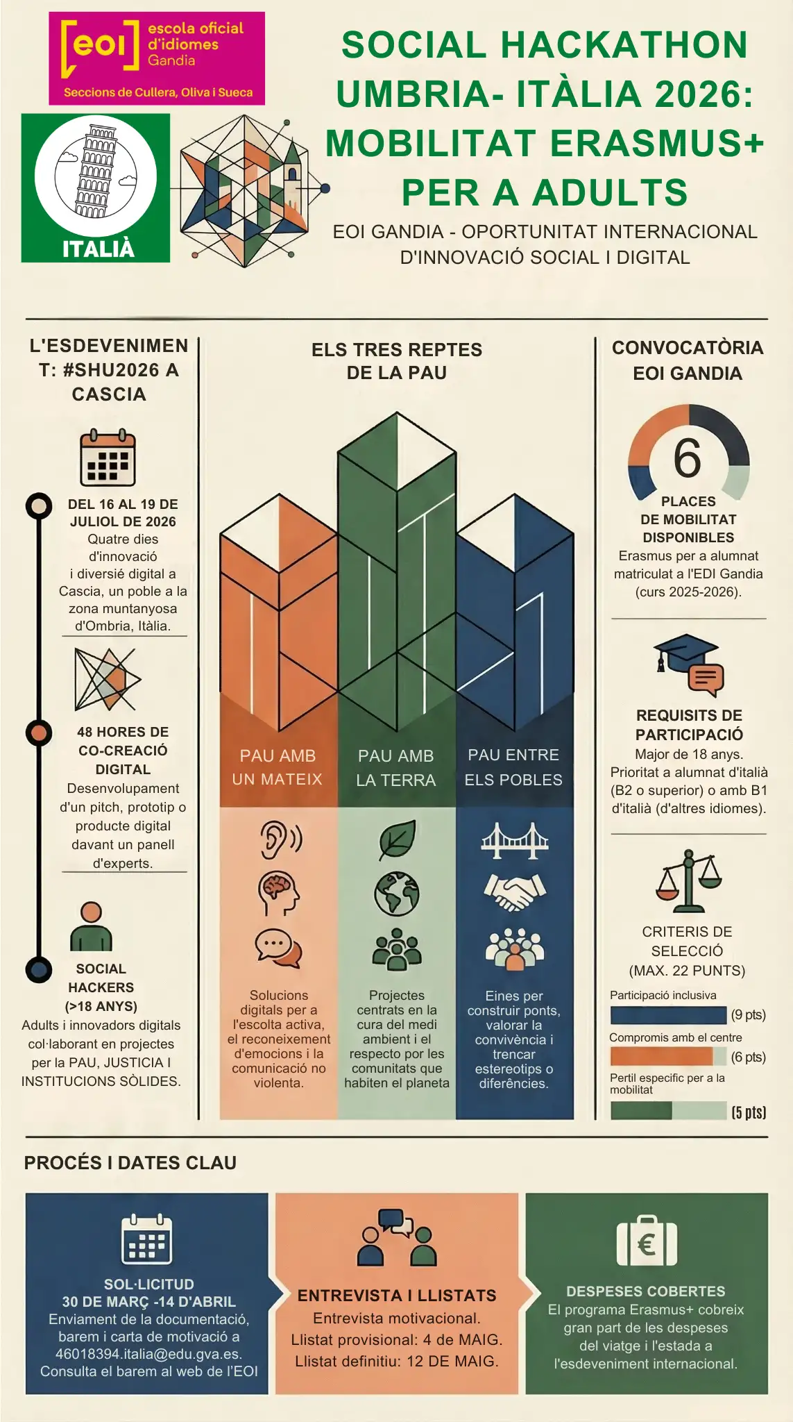 Eres alumna/e d’italià? Vols fer una mobilitat Erasmus com a estudiant a Itàlia? Pots trobar més informació de l’event ací SOCIAL HACKATHON UMBRIA. Ací tens tots els criteris de selecció.