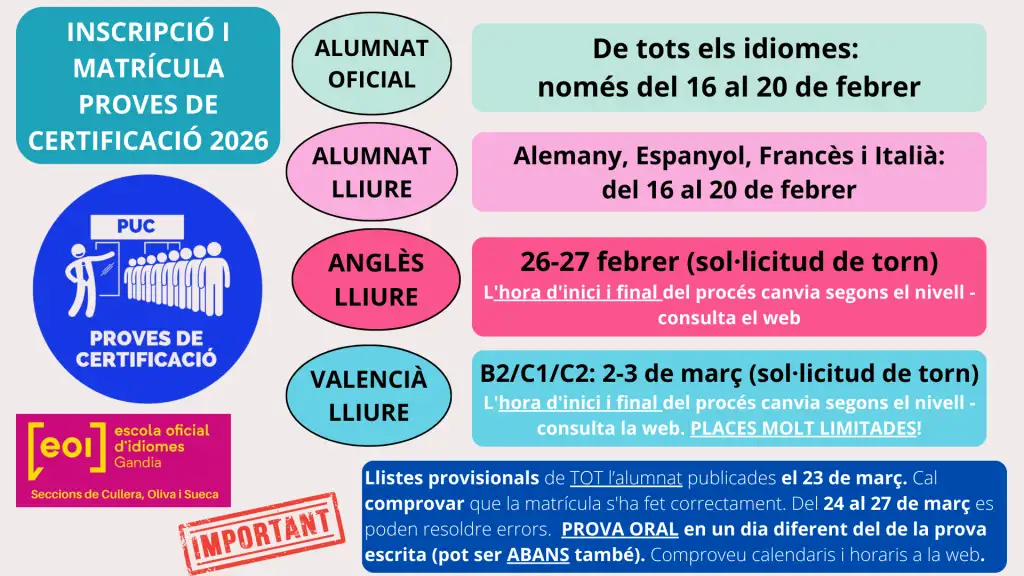 Cronograma i dates dels tràmits de matriculació de les proves de certificació2026 (pdf).