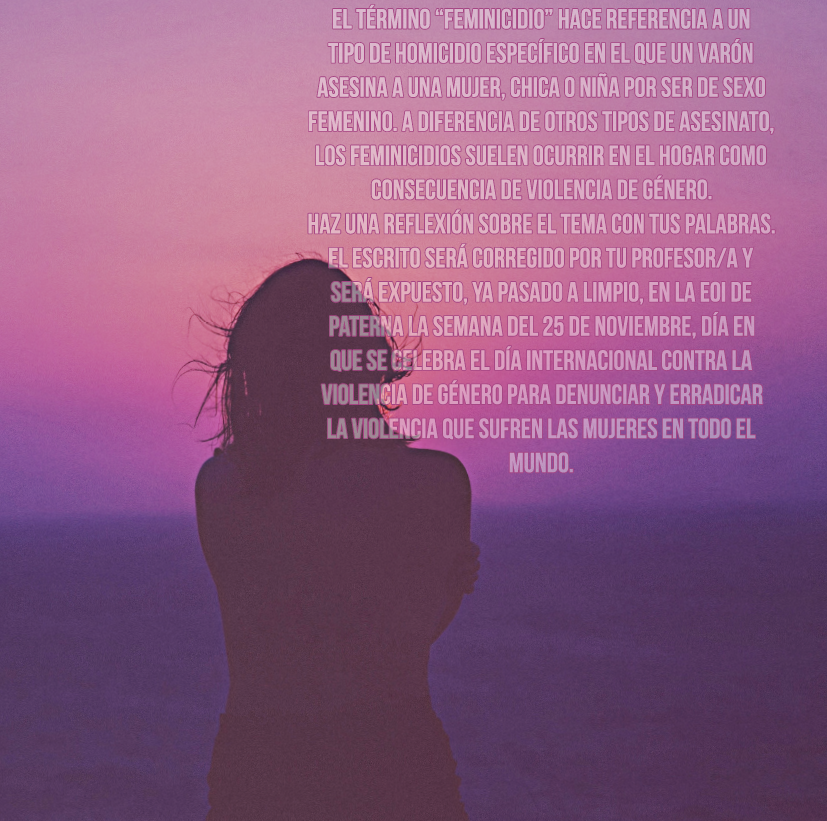 Haz una reflexión sobre el tema con tus palabras. El escrito será corregido por tu profesor/a y será expuesto, ya pasado a limpio, en la EOI de Paterna y la sección de Manises la semana del 25 de noviembre,día en que se celebra el Día Internacional contra la Violencia de Género para denunciar y erradicar la violencia que sufren las mujeres en todo el mundo.