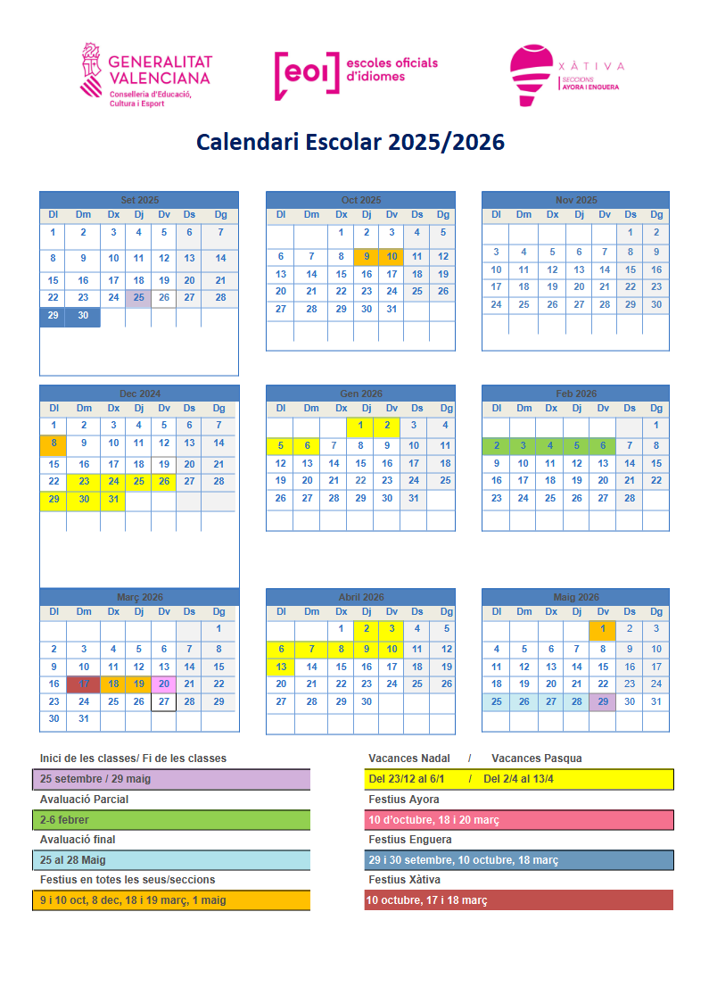 Consulta els períodes de vacances escolars, els festius per localitats (Xàtiva, Ayora i Enguera), i l'inici i finalització de les classes.