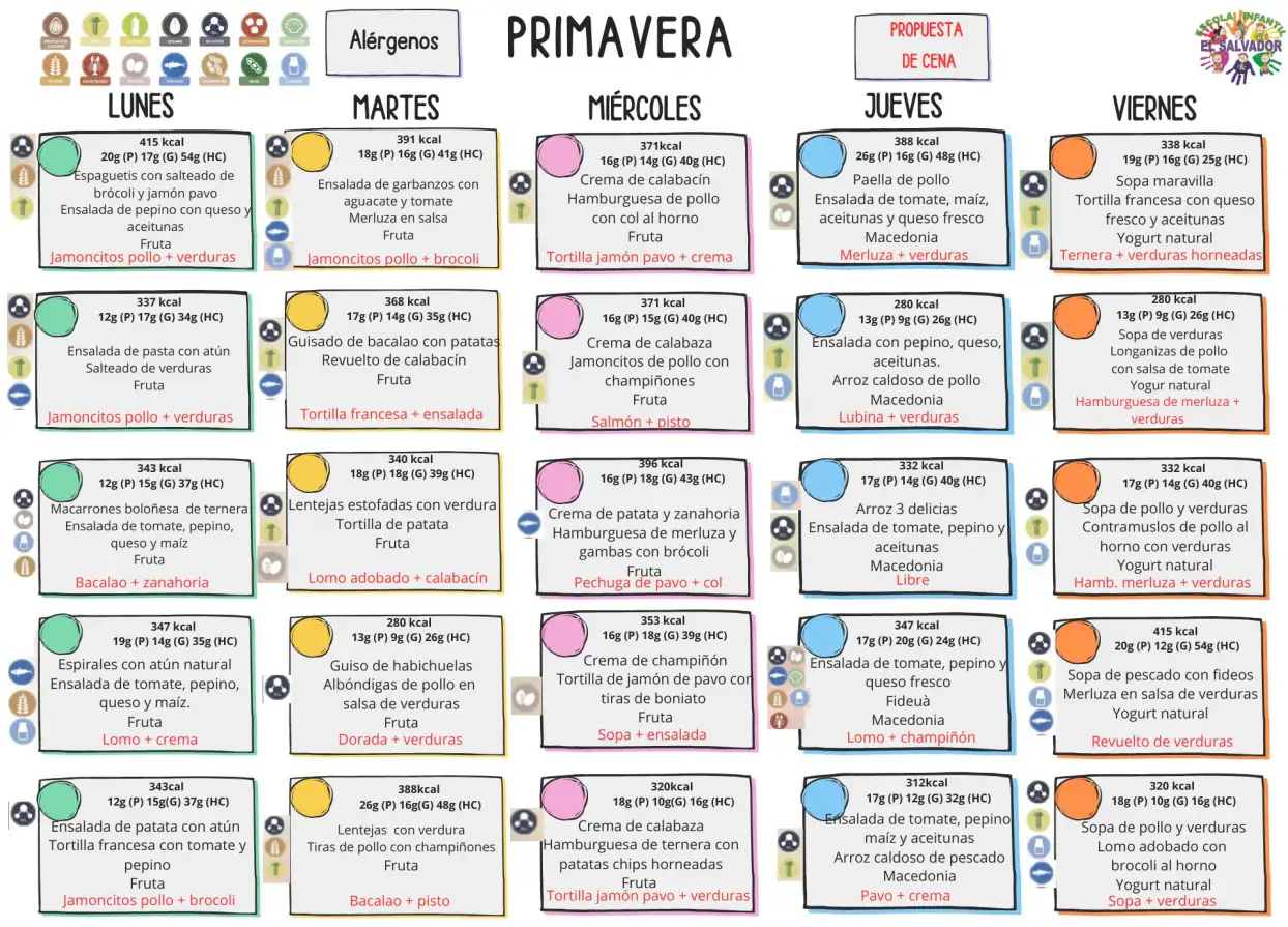 En primer lloc, un dels aspectes que ha sigut modificat és el menú., els quals han sigut confeccionats per un nutricionista local (Jose Gutiérrez Nutrición). Actualment, tenim tres tipus de menús basats en les estacions de l’any del curs escolar (TARDOR, HIVERN I PRIMAVERA) amb la finalitat d’oferir als infants un menú variat, amb aliments propis de la temporada, i basat sempre en les seues necessitats nutricionals. A més, aquests menús s’adapten a les intoleràncies presentades pels infants, per aquest motiu, tenim a l’abast el menú normal que se’ls fa arribar als tutors legals dels xiquets/es, i el menú d’intoleràncies que se’ls fa arribar a les famílies dels infants que la presenten per tal que estiguen assabentats en tot moment, d’allò que mengen els seus fills/es.