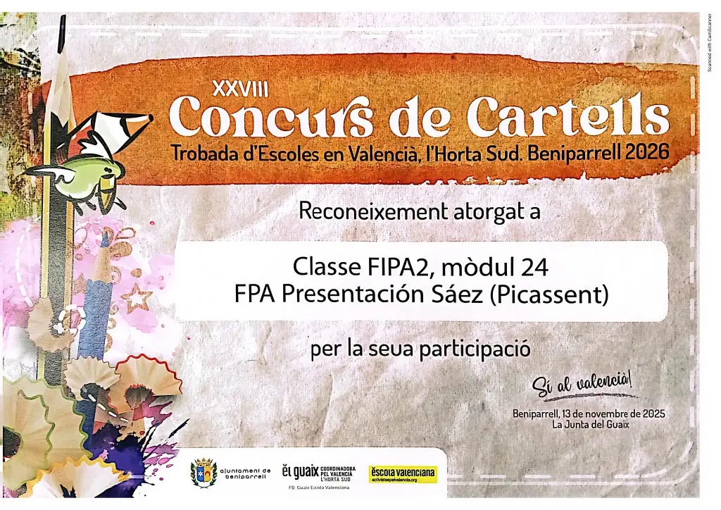 Un dels primers passos d’este curs 2025-2026 ha sigut la nostra participació en el concurs de cartells, on de tota la nostra escola vam elegir el treball realitzat per la classe de FIPA II del mòdul 24. Un treball del CEIP Jaume I d’Alcàsser va guanyar el concurs. Tots els treballs (també el nostre) es poden trobar al calendari de 2026 del GUAIX (Coordinadora pel Valencià l’Horta Sud).