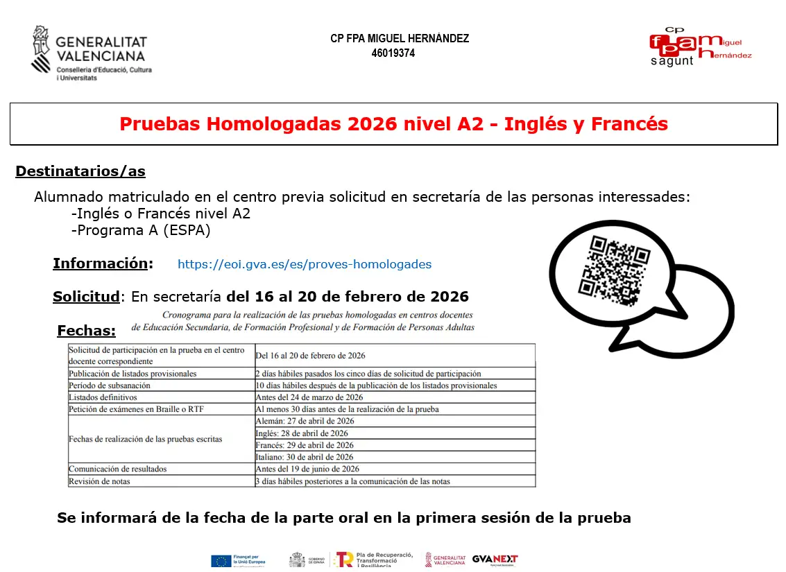 El alumnado del CP FPA Miguel Hernández puede solicitar la participación en las pruebas homologadas de nivel A2 de inglés y francés para el curso 2025/2026, que permiten obtener el certificado oficial de la Comunitat Valenciana.