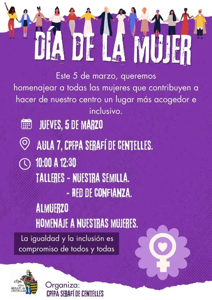 ✨ El jueves 5 de marzo celebraremos juntas y juntos el valor de todas las mujeres del centro en una mañana especial de 10:00 a 12:30. Durante ese tiempo compartiremos talleres participativos, un almuerzo en comunidad y culminaremos con un homenaje lleno de emoción para reconocer a quienes nos inspiran cada día.