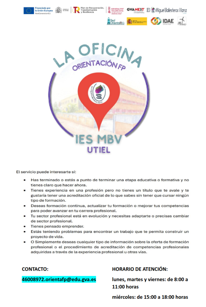 18/09/2023 Ja s'han publicat els horaris provisionals dels diferents grups. Podeu consultar-los en el següent enllaç: https://portal.edu.gva.es/fpavalledeayora/es/horarios-y-grupos-va