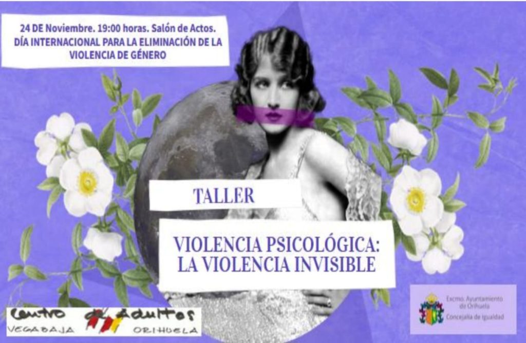 Amb motiu de la commemoració del dia internacional aparia l’eliminació de la violència de gènere (25 Novembre), des de l’Escola d’Adults d’Orihuela s’ha previst impartir el taller temàtic “Violència psicològica: la violència invisible”, els continguts de la qual s’enfoquen cap a l’educació en igualtat com a major ferramenta preventiva en la lluita contra la violència de gènere.