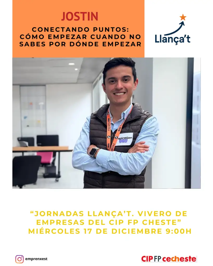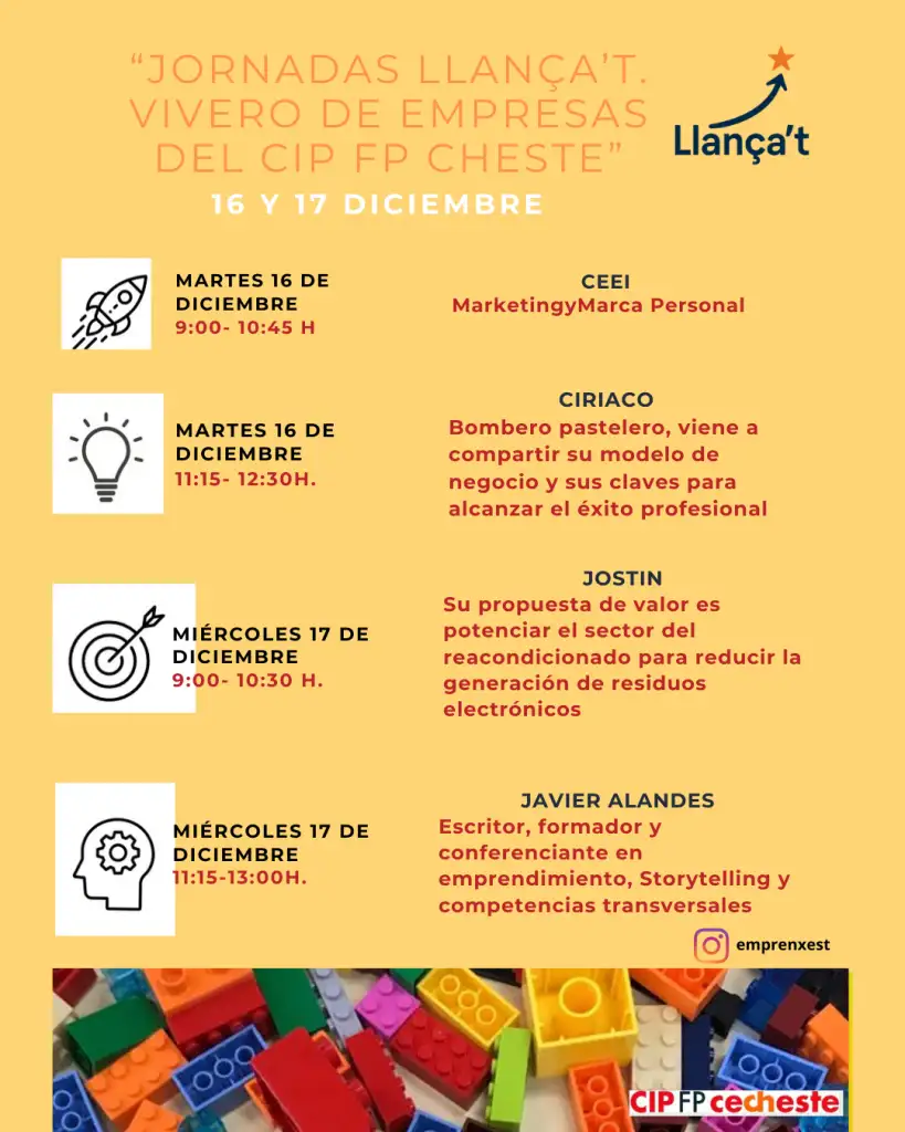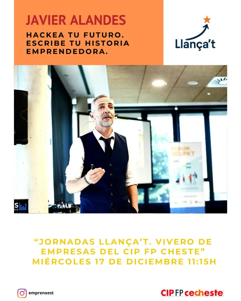 El dimecres 18 de desembre començarem amb la ponència del jove empresari @jostinmarinosorio que ens acostarà a la realitat, amb la seua ponència “com començar quan no se sap per on”. I com a tancament comptarem amb la presència de l’escriptor @j_alandes que ens delectarà amb la seua conferència “Hackea tu futur: Escriu la teua pròpia història emprenedora”.