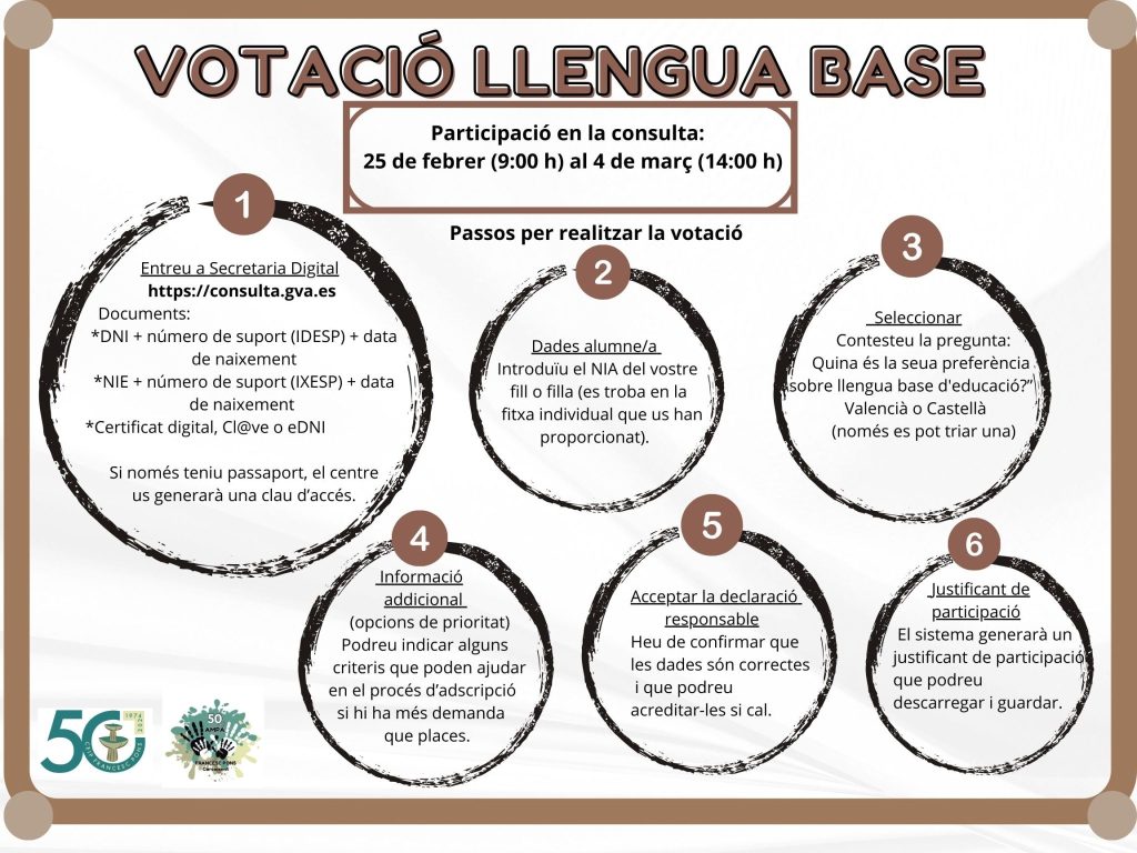 Seguint les instruccions de l’ordre 2/2025, de 7 de febrer de la Conselleria d’Educació, Cultura, Universitat i Ocupació, per la qual es regula i convoca el procediment de consulta als representants legals de l’alumnat per a triar la llengua base aplicable a partir del curs escolar 2025- 2026, en el dia de hui 6 de març de 2025, s’han de publicar els resultats de l’enquesta. La suspensió de les classes fa que no puga’m penjar els resultats al tauló intern de Secretaria, és per això que vos comuniquem els resultats obtinguts i en el moment es reprenen les classes estaran exposats al tauló intern del centre.