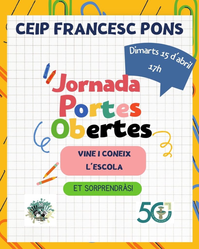 El proper 20 d’abril comença el període d’admissió. Si esteu interessats en que els vostres fills/es estudien a la nostra escola, del 18 al 20 d’abril farem les jornades de portes obertes. Cal sol·licitar cita prèvia telefonant al Centre al 962457575 o mitjançant un e-mail al 46002702@edu.gva.es. Animeu-vos! Vingueu i conegueu el Pons!