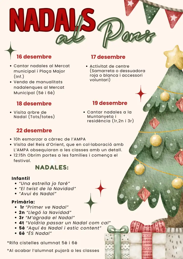 El proper dijous 22 de desembre acomiadarem el trimestre amb una programació molt especial. I és que tornarem a obrir portes per a que les famílies assistiu al Festival Nadalenc que estem preparant amb més il·lusió que mai després d’aquests anys de pandèmia, així també, tindrem la visita de Ses Majestats els Reis Mags, xocolatada… tot açò i molt més el 22 de desembre!! No us ho podeu perdre!!