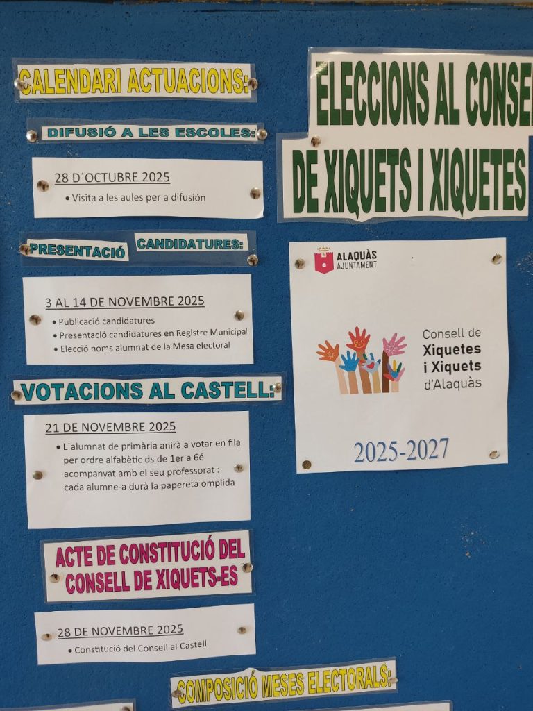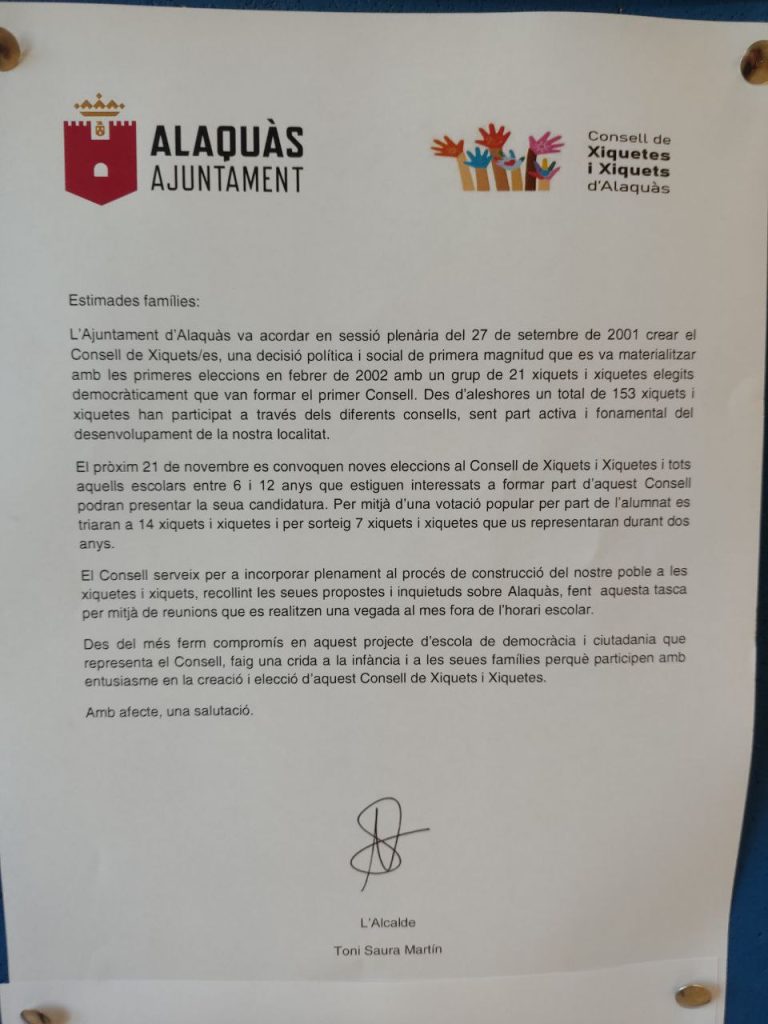 El pròxim 21 de novembre tenim eleccions al Consell Escolar de xiquets i Xiquetes d’Alaquàs. Està funcionant durant molt anys amb representació de totes les escoles del poble. Antics alumnes membres de l’actual Consell vindran a l’escola a resoldre dubtes i explicar la dinàmica del Consell, així com estimular la presentació de candidatures entre els nostres alumnes.