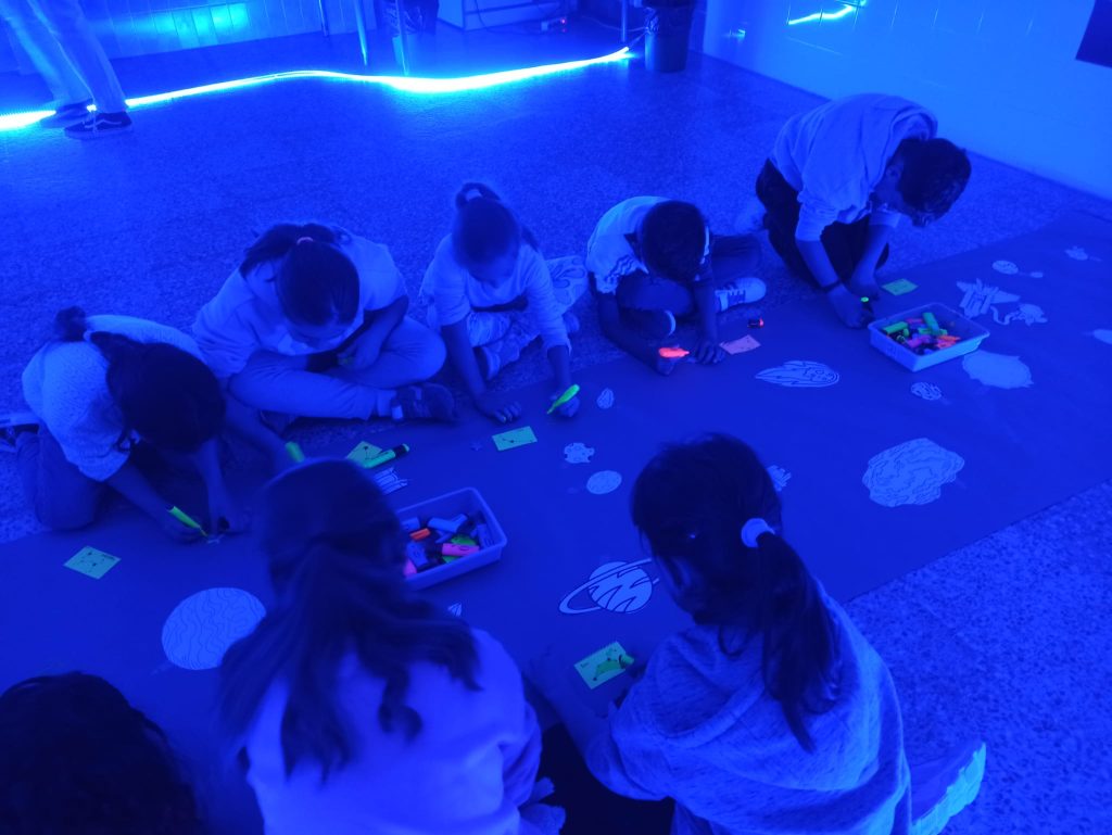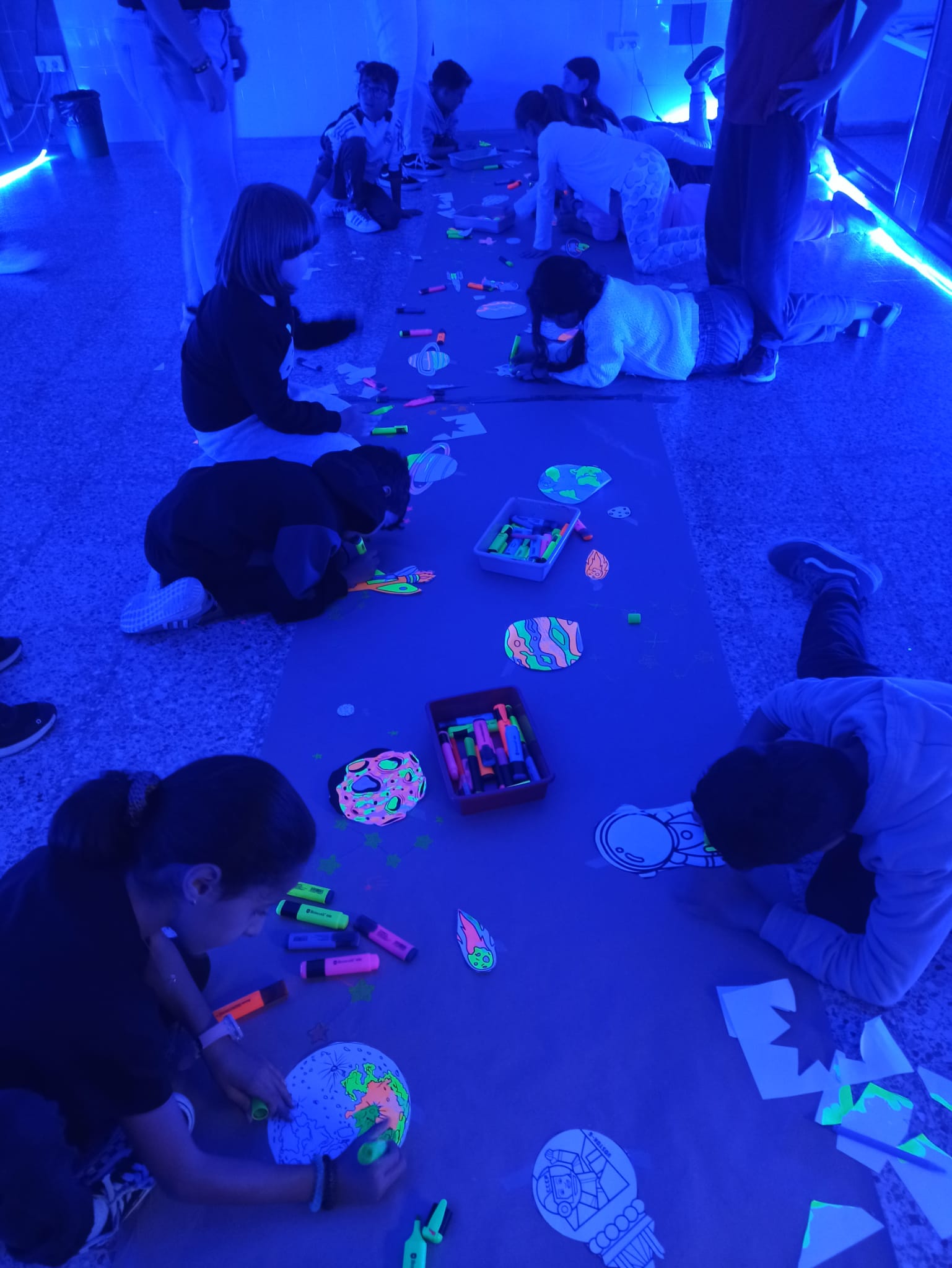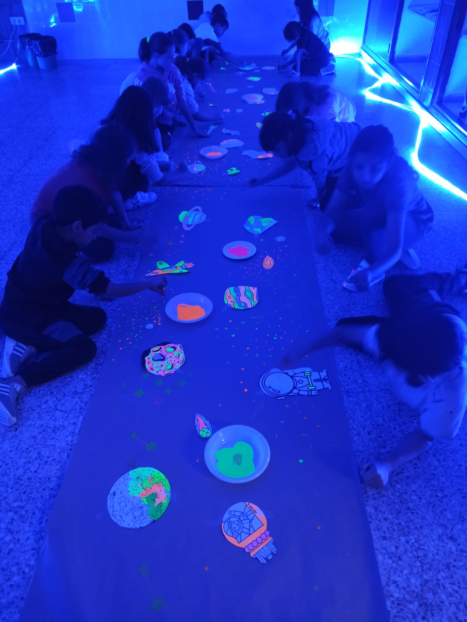 L’alumnat de tercer de primària ha descobert la figura de Valentina Tereshkova, la primera dona que viatjà a l’espai. Han conegut la seua vida, i la importància del seu llegat. Després, treballant en equip i utilitzant pintures fosforescents, han creat en un llenç col·laboratiu un meravellós univers ple de llum, color i imaginació. Una experiència artística i inspiradora que els ha apropat encara més a la ciència i a l’espai.