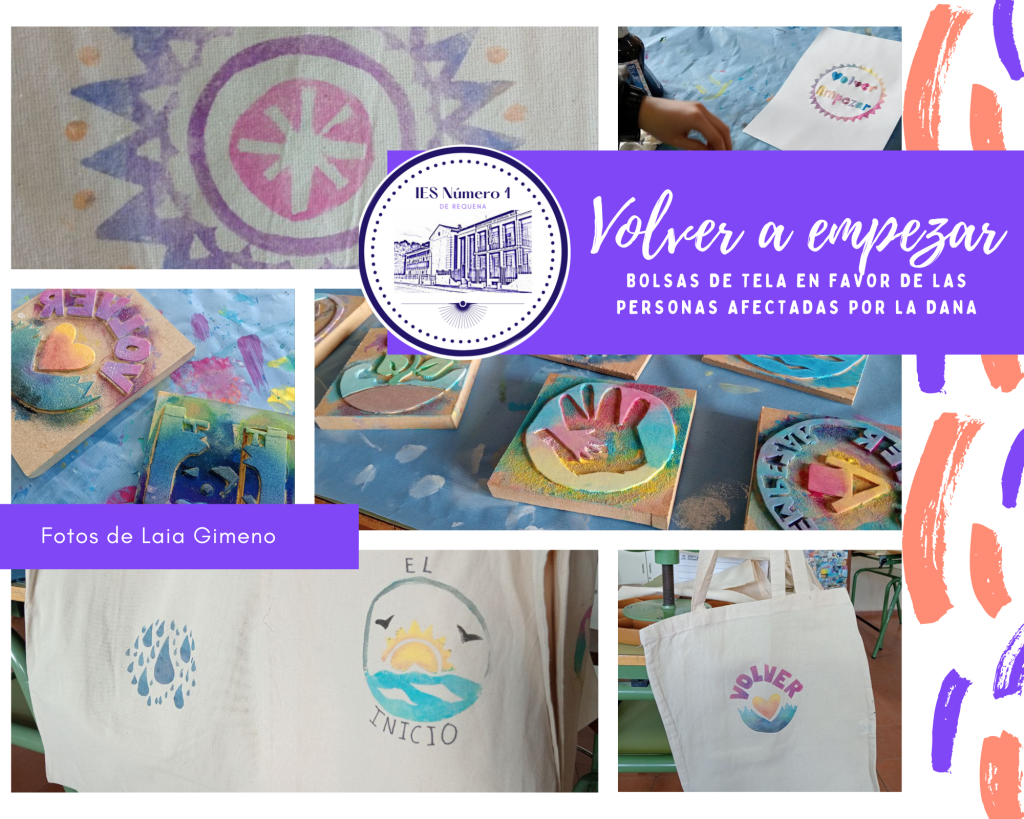 Los alumnos y alumnas de Plástica del IES Número 1, de Requena, están llevando a cabo un proyecto solidario con los centros afectados por la DANA. Los objetivos esenciales del proyecto han recaído en el diseño y confección de bolsas de tela con el lema «VOLVER A EMPEZAR», en apoyo a todos aquellos alumnos y alumnas que han sufrido pérdidas, tanto materiales como personales, en las brutales inundaciones sucedidas el pasado 29 de octubre en diferentes puntos de la provincia de Valencia.