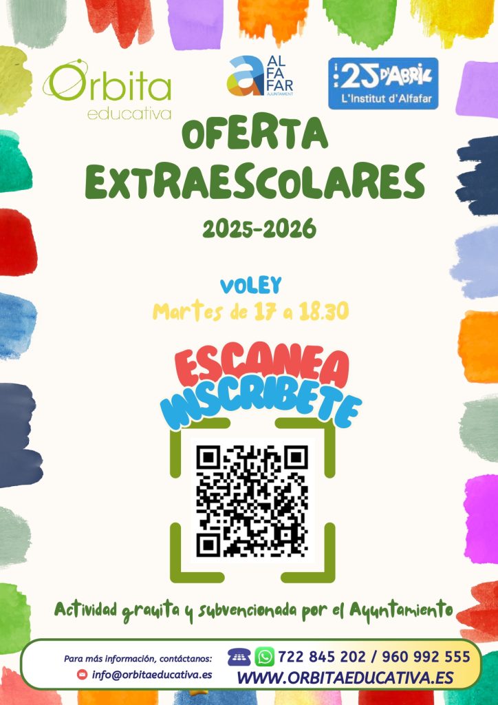 S’inicia el període d’inscripció a l’activitat extraescolar de voleibol en l’IES 25 d’Abril per a l’alumnat del centre. Es tracta d’una activitat totalment gratuïta subvencionada per l’Ajuntament d’Alfafar que es realitzarà en les instal·lacions de l’institut les vesprades dels dimarts de 17.00 a 18.30 hores. Si estàs interessat no dubtes a apuntar-te.
