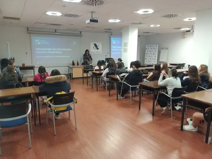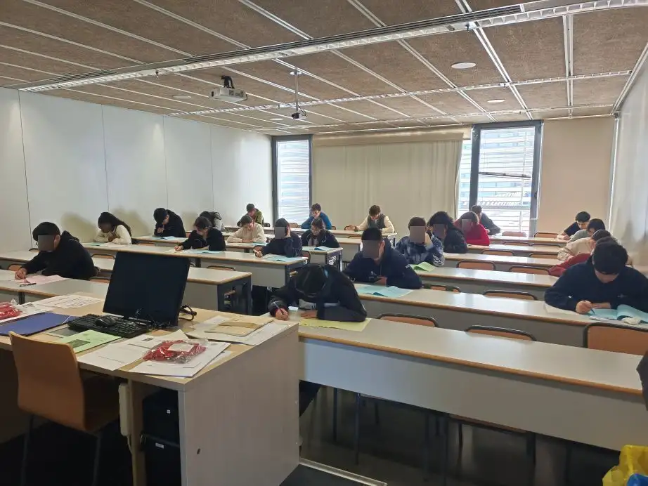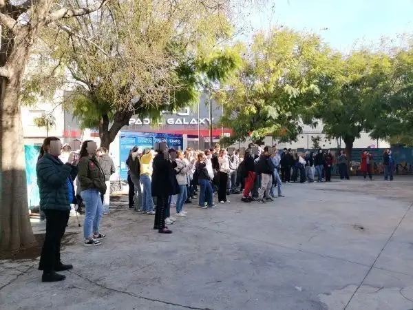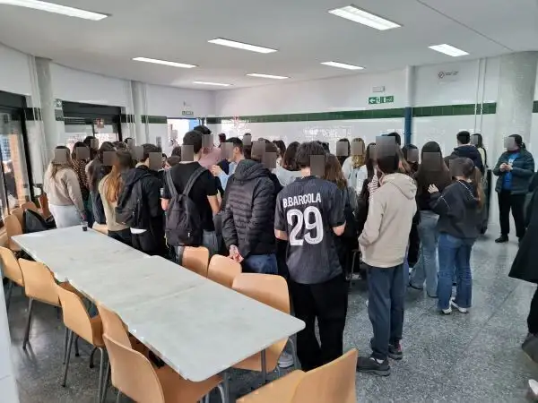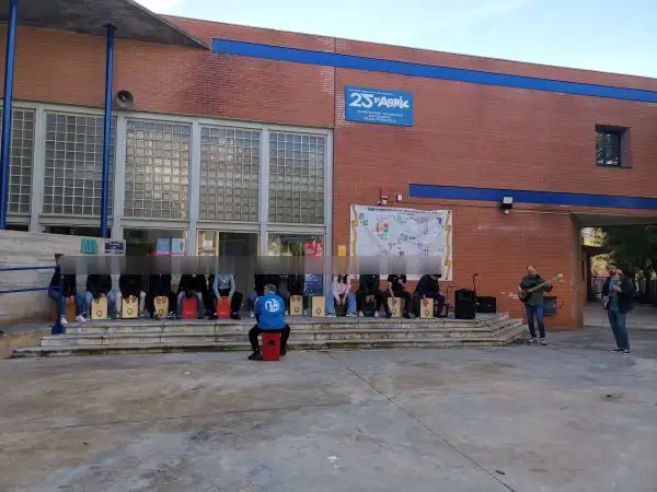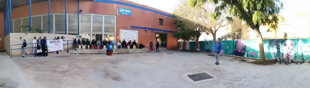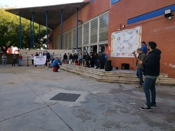 Los/las recibimos en la entrada del instituto con parte de nuestro alumnado del Equipo de mediación, especialmente el que fue a Benicasim en diciembre a la jornada de formación y convivencia, con el alumnado de la optativa de música de 4.º de ESO interpretando dos piezas de percusión con cajón flamenco acompañados al bajo por Jordi Martínez, profesor de música, y a la guitarra por Jesús Mérida, profesor de Castellano, y todos/as dirigidos por Pascual Cardona, profesor de música.