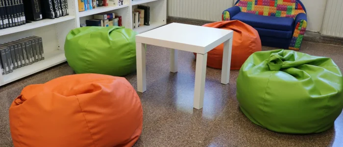 • El “Espai de lectura chill out”, amb quatre pufs i un sofà on l’alumnat pot sentir-se còmode i relaxat per a llegir.