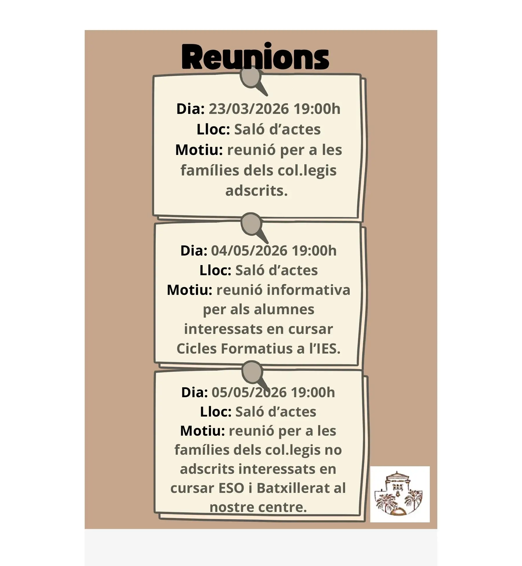 Tenim reunions en els pròxims mesos per a alumnat de centres adscrits i no adscrits que vulgui cursar ESO o Batxillerat i per a alumnat interessat en Cicles formatius.