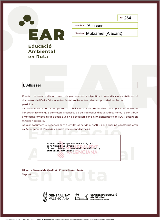 Ens han concedit l’adhesió a l’EAR (Educació Ambiental en Ruta), la xarxa d’entitats de la Comunitat Valenciana que pertany al Centre d’Educació Ambiental (CEACV) de la Generalitat Valenciana.