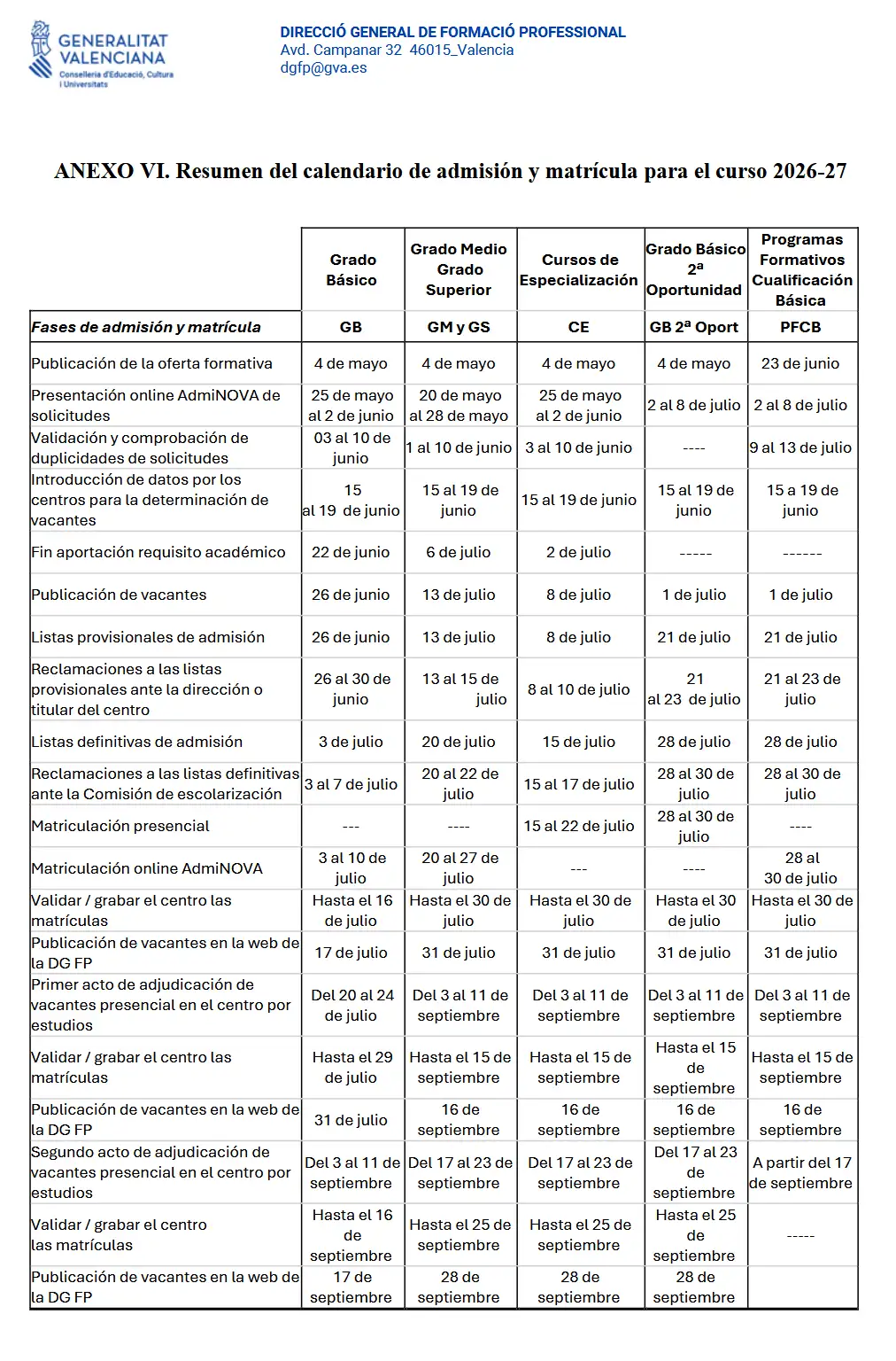 A continuació trobaran el resum del procés d’admisó de Cicles Formatius (Mitjà i Superior) FP Bàsica i Cursos d’Espècialització per al curs 2026/27: