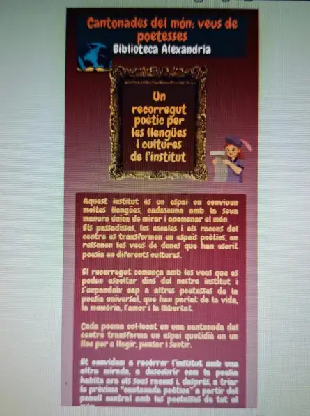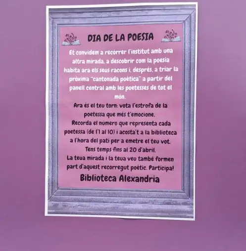 Actualment, la biblioteca celebra el Dia de la Poesia amb una proposta dedicada a deu grans poeteses de tots els temps i de diferents parts del món. L’alumnat ha sigut convidat a votar quina estrofa d’aquestes autores desitja que es convertisca en la pròxima Esquina Poètica del centre.