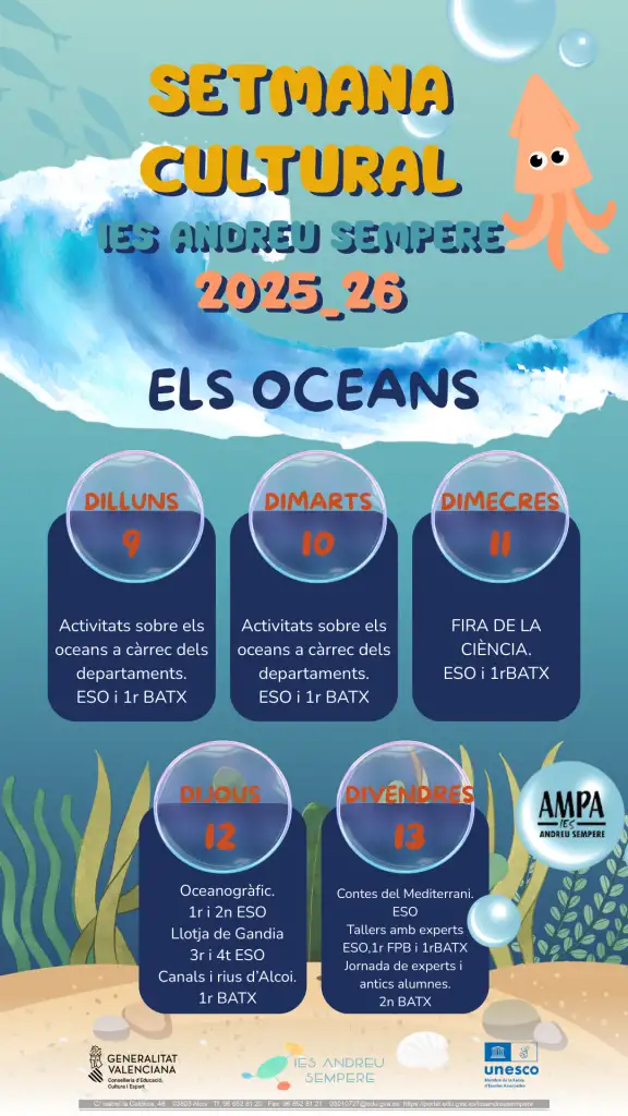 Amb motiu de la Dècada dels Oceans (2021–2030), declarada per la UNESCO, l’IES Andreu Sempere, escola associada UNESCO, proposa dedicar la Setmana Cultural a descobrir la importància dels oceans des de diferents perspectives: ambiental, econòmica, històrica i cultural.