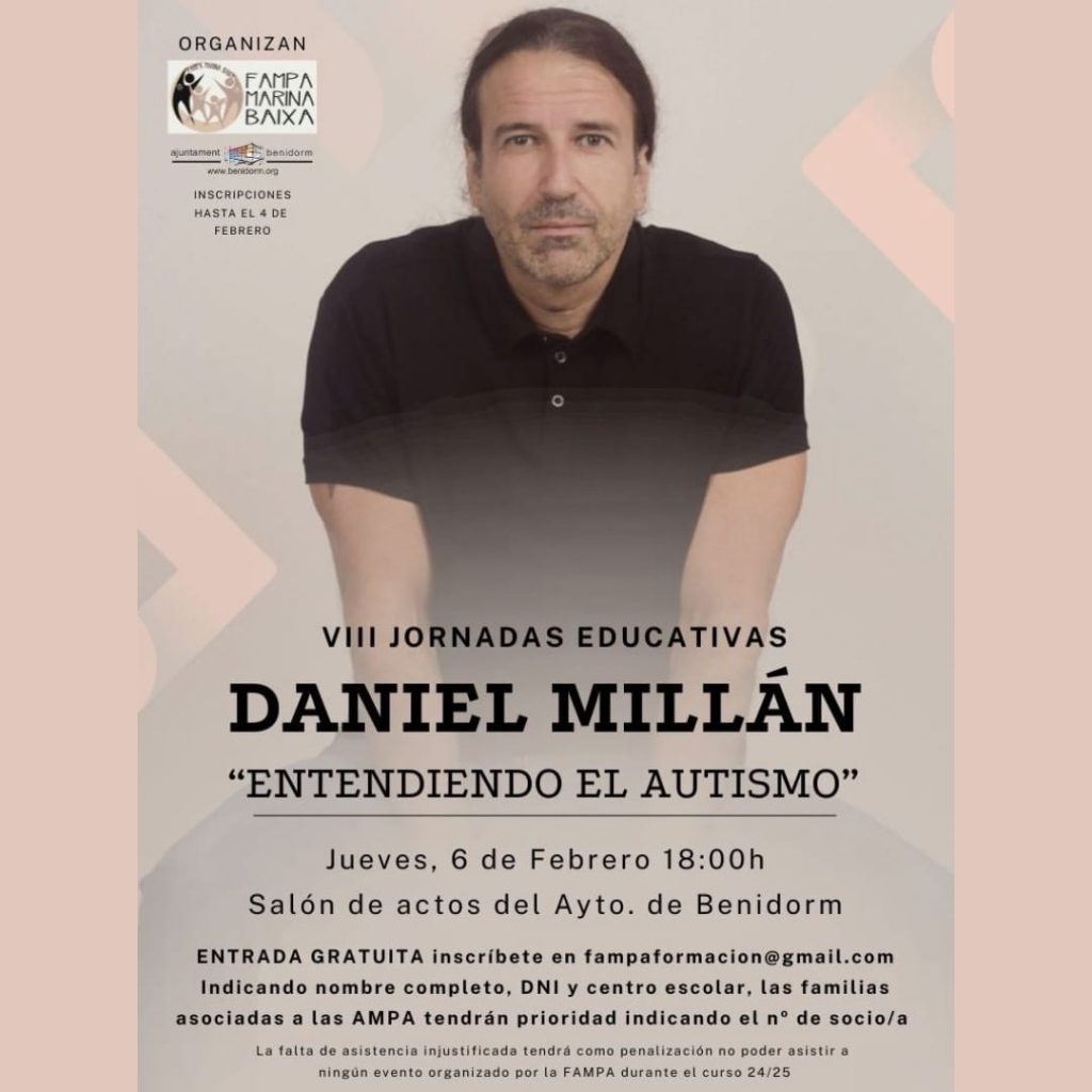La FAMPA MARINA BAIXA en colaboración con la Concejalía de Educación del Ayuntamiento de Benidorm, organizan la charla «Entendiendo el Autismo» que se impartirá por el psicólogo especializado Daniel Millán.