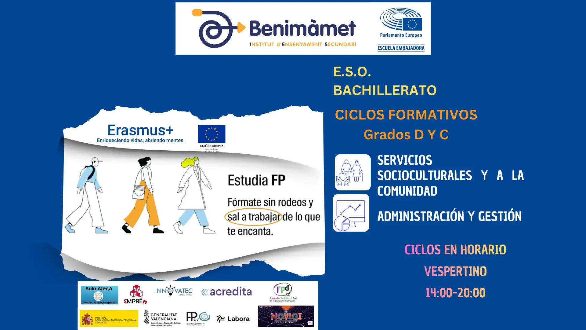 - y Formación Profesional Básica de Servicios Administrativos, Ciclos Formativos de la familia Administrativa de grado Medio y Superior y Ciclos Formativos de la familia de Servicios a la Comunidad de grado Medio en turno de tarde.