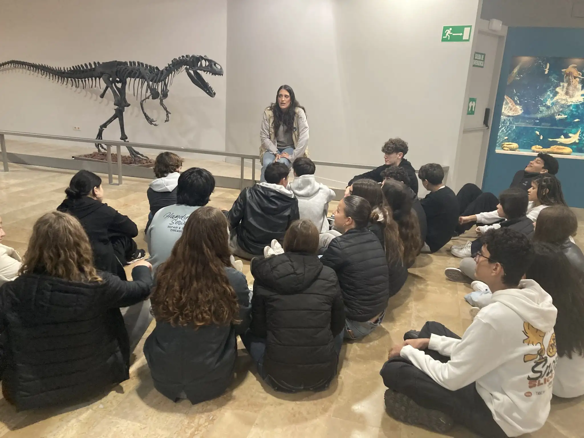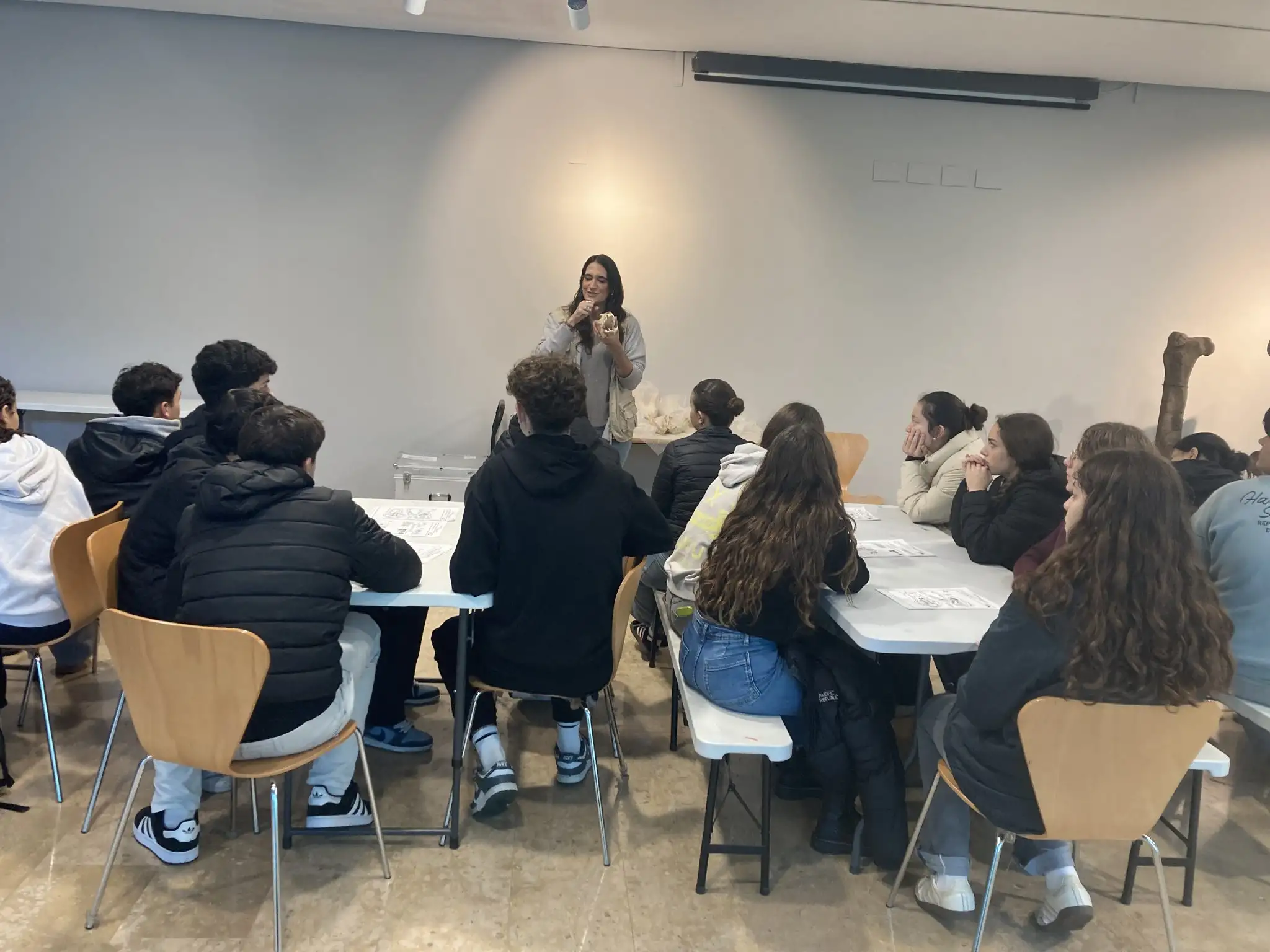 Durant l’activitat, vam fer una visita guiada pel museu en la qual vam seguir pas a pas la història dels éssers vius que han poblat la Terra al llarg del temps, observant diferents fòssils de cada època. A més, vam participar en un taller d’anàlisi de cranis, on intentàvem esbrinar a quin tipus d’animal pertanyia cadascun a partir de la posició dels ulls, la forma de les dents, la presència de diastema i altres característiques.