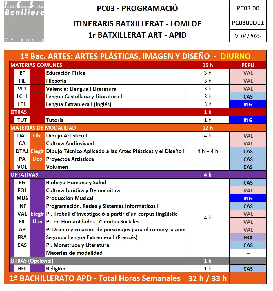 1r Batxillerat ARTS – Vía: Arts Plàstiques, Imatge i Disseny