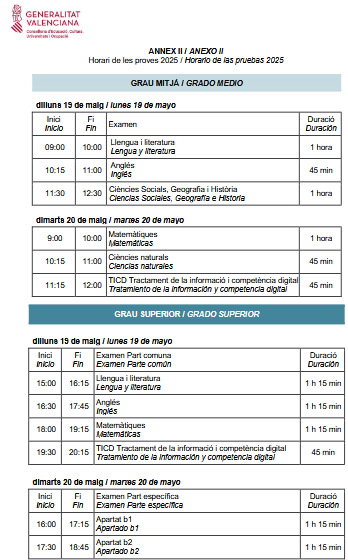 Horario pruebas de acceso
