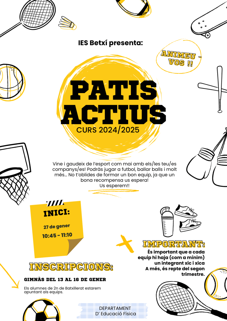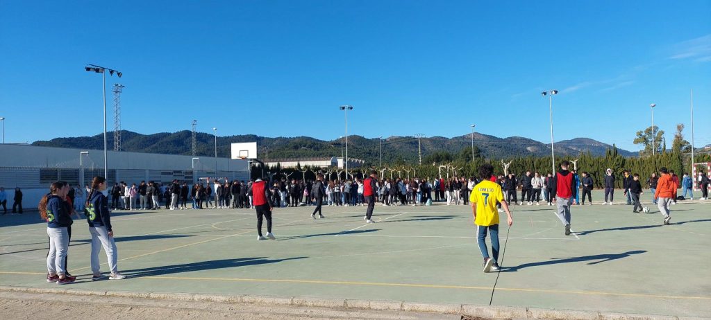 Durant aquest segon trimestre del curs 24/25 s’està duent a terme el projecte de patis actius amb l’alumnat de l’IES. Una quantitat gran d’esports i especialitats per gaudir dels patis amb un ambient sa, de diversió, coeducació i entreteniment. L’alumnat que cursa l’assignatura optativa d’activitat física per a la salut i el desenvolupament personal, és la comissió encarregada de regular les fases de la competició en les diferents disciplines: Futbol, Futbol-tennis, Bàsquet, Handbol, Pilota Valenciana, Hoquei i ball.