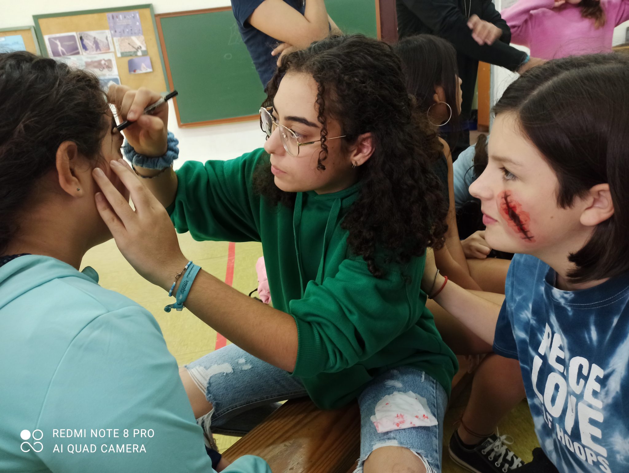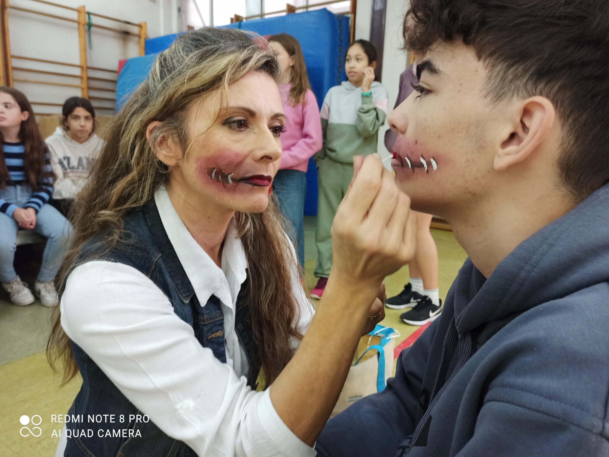Hoy, 28 de octubre, personal de conserjería y alumnado voluntario, ha maquillado en el gimnasio con temática de Halloween dentro de las actividades de «Patios Activos».