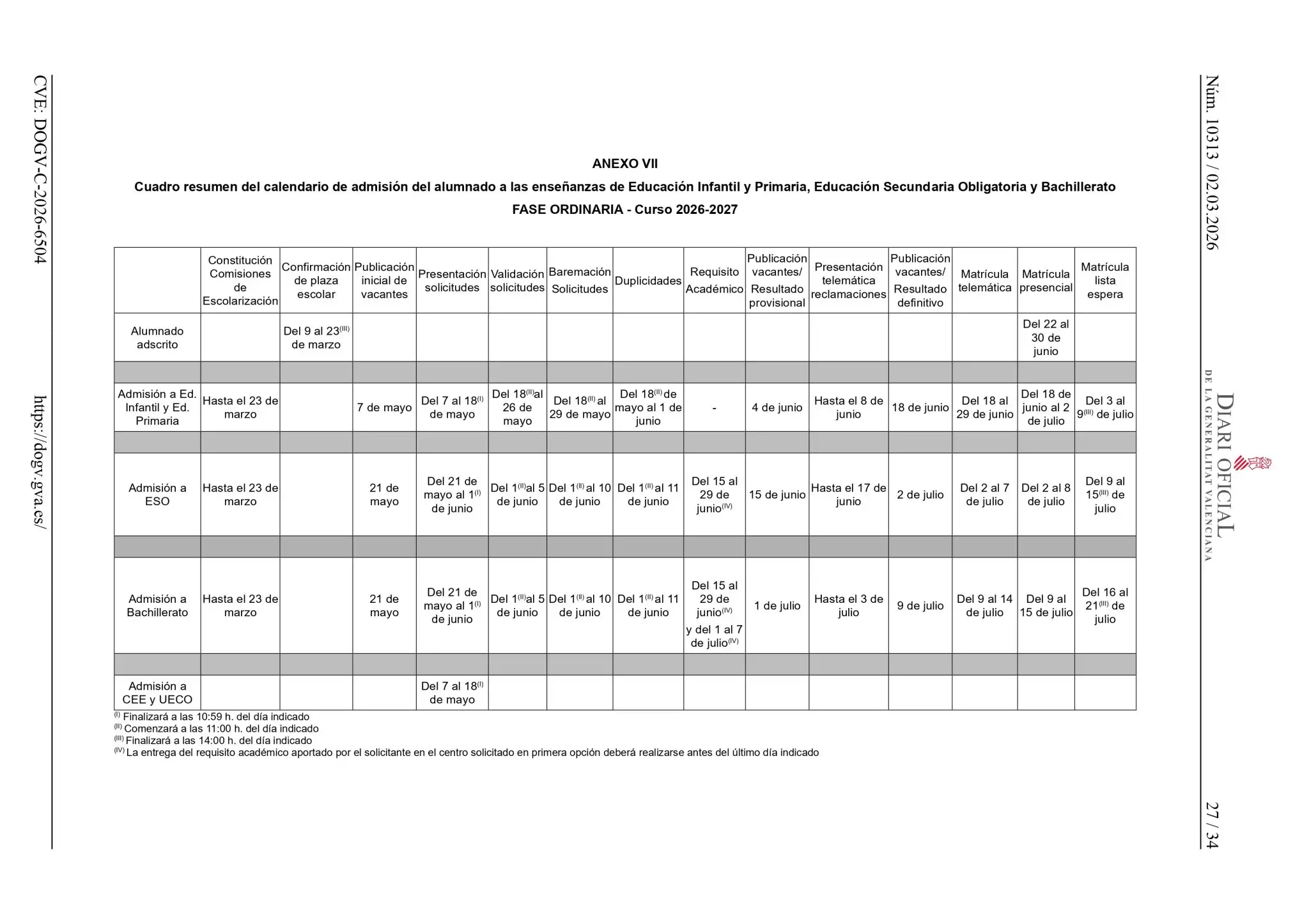 CALENDARIO DE ADMISIÓN FASE ORDINARIA CURSO 2026-2027