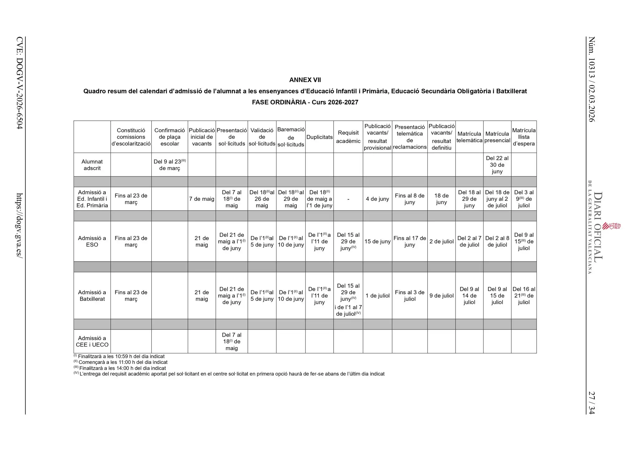 CALENDARI D’ADMISSIÓ FASE ORDINÀRIA CURS 2026-2027