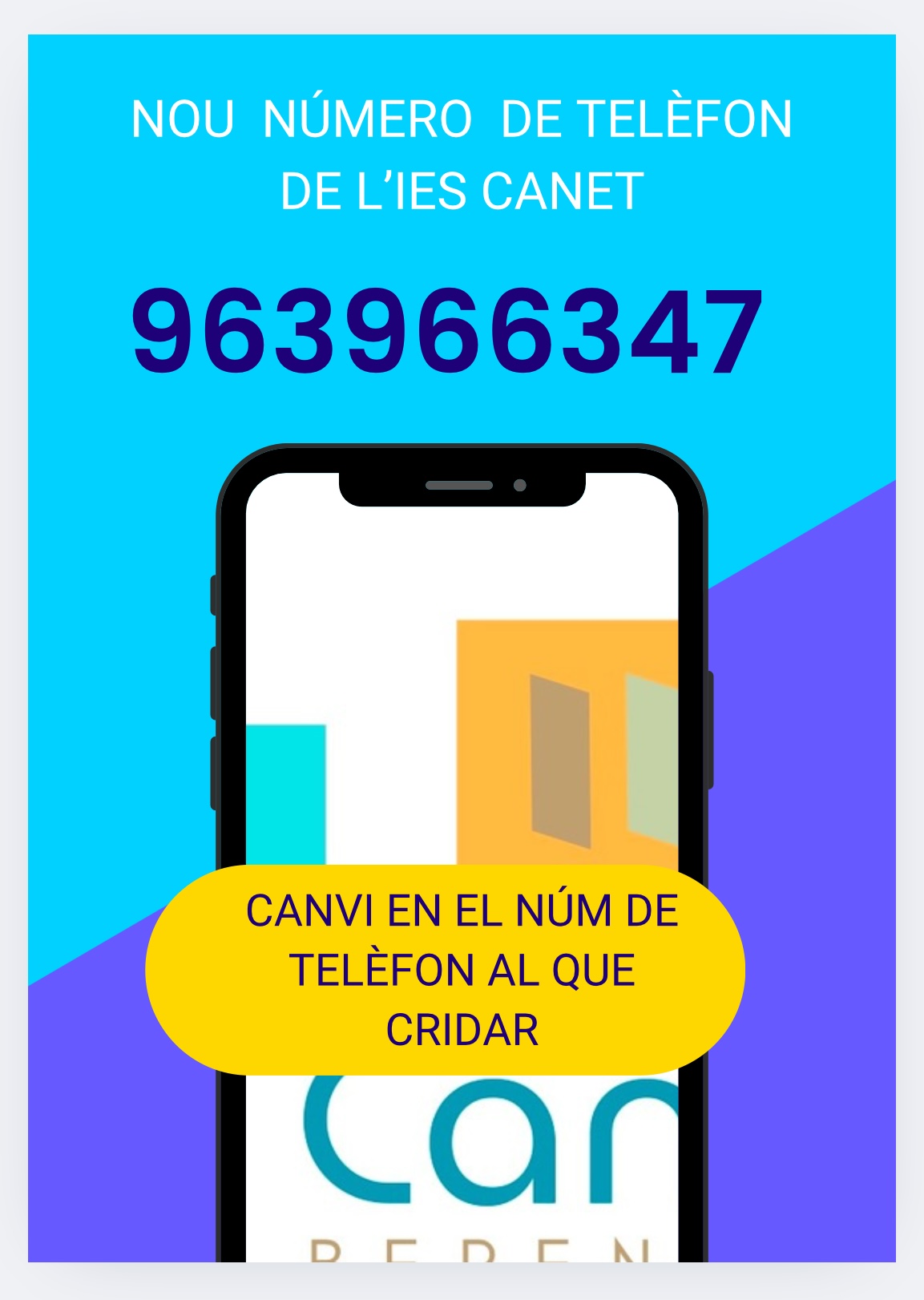 Ús volem informar que, a partir d’aquest moment, el NÚM. DE TELÈFON DEL CENTRE al que caldrà cridar ÉS: 963966347. Moltes gràcies.
