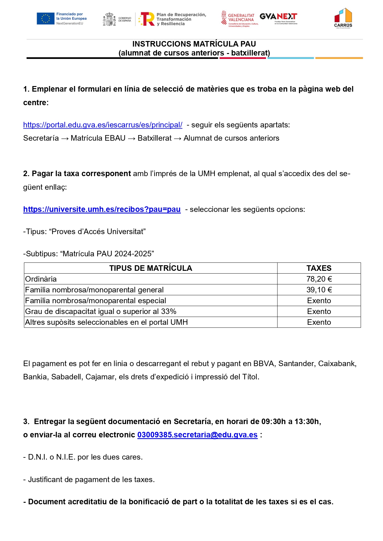 - Enviar al correu electrònic 03009385.secretaria@edu.gva.es amb l’assumpte MATRICULA PAU EXTRAORDINARIA la següent documentació: