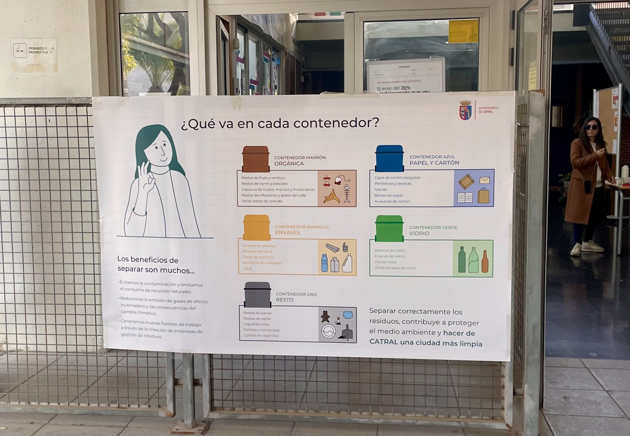 Durante el recreo de los días 10 y 16 de diciembre, el IES Catral cuenta con un puesto de información sobre el reciclaje en el patio. Los alumnos y alumnas del centro podrán aprender a separar los residuos y así proteger el medio ambiente. Además, se obsequia al alumnado interesado con una libreta y boli y bolsa de algodón hasta agotar existencias. Esta actividad es posible gracias al Ayuntamiento de Catral y a la empresa Acciona.