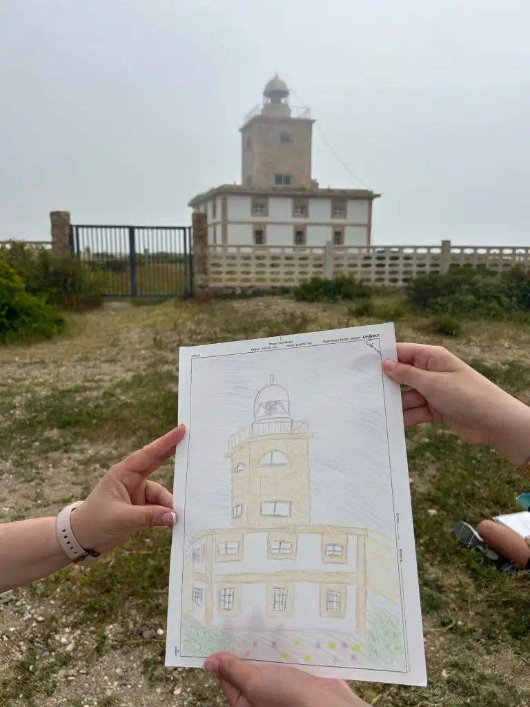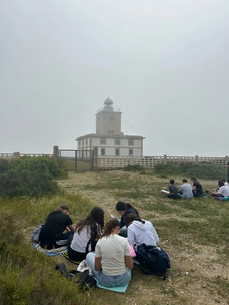 La actividad continuó con un desplazamiento hasta el Faro de Tabarca, donde el alumnado realizó una práctica artística al aire libre. Sentados alrededor del faro, los estudiantes trabajaron la perspectiva mediante el dibujo del edificio, identificando sus diferentes partes y aplicando color a sus composiciones. Cabe destacar la gran implicación del alumnado en esta actividad, que se tradujo en resultados de muy buena calidad.