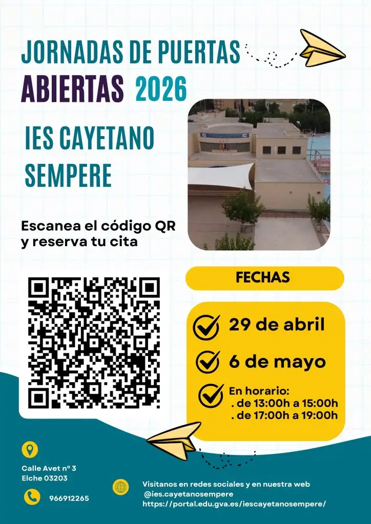 Si quieres conocer nuestro centro, te brindamos la posibilidad de venir a visitarnos. Las fechas previstas son: Ambos días tienen doble turno: Si te animas, solo tienes que rellenar el siguiente formulario: RESERVA TU VISITA: JORNADAS DE PUERTAS ABIERTAS INSTITUTO CAYETANO SEMPERE - Reuniones colegios adscritos 6º primaria