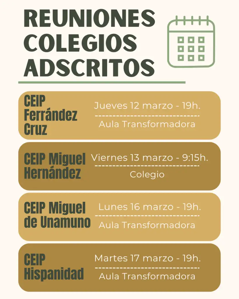 La semana que viene comienzan las charlas informativas para las familias de 6º de primaria de nuestros colegios adscritos. El horario es el siguiente: - Circunstancia específica