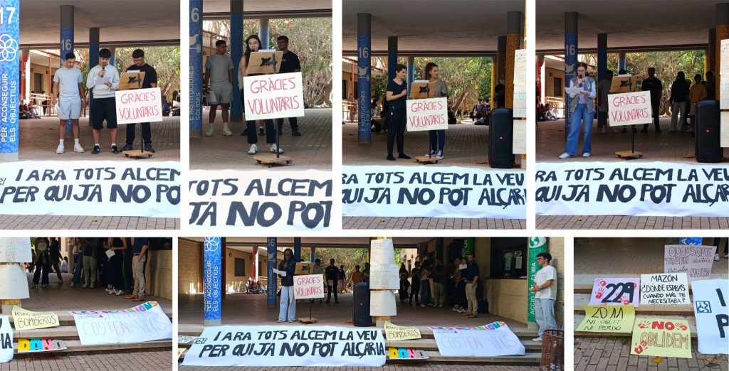 Un año después de la devastadora DANA de 2024, que golpeó con fuerza la provincia de Valencia, el IES Cayetano Sempere de Elche ha celebrado este miércoles un multitudinario acto conmemorativo lleno de homenajes a las víctimas, organizado por el grupo de 2º de Bachillerato A. Durante el acto, se han podido ver pancartas elaboradas por los estudiantes, con mensajes que reflejaban el malestar ante la inacción y la falta de verdad por parte de las instituciones valencianas. En la pancarta principal se ha podido leer «Y ahora todos alzamos la voz, por quien ya no puede alzarla». Según el alumnado, se trata de «no olvidar la tragedia ni la negligente gestión de ella». Dos alumnas han leído los testimonios de varias niñas que se vieron directamente afectadas aquel fatídico 29 de octubre. También se ha guardado un minuto de silencio en homenaje a las 229 víctimas y a todos los afectados, se ha leído un poema por parte de alumnos de CCFF y dos profesoras han interpretado la canción «Ladrones de sobremesa».
